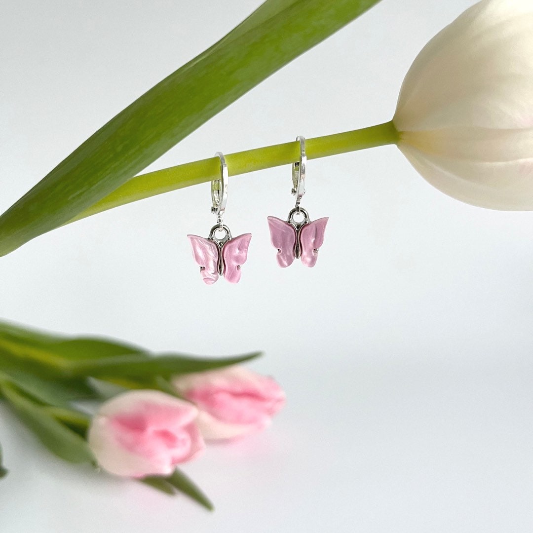 Pink Butterfly Earrings Silver Hoop Earrings Butterfly Etsy